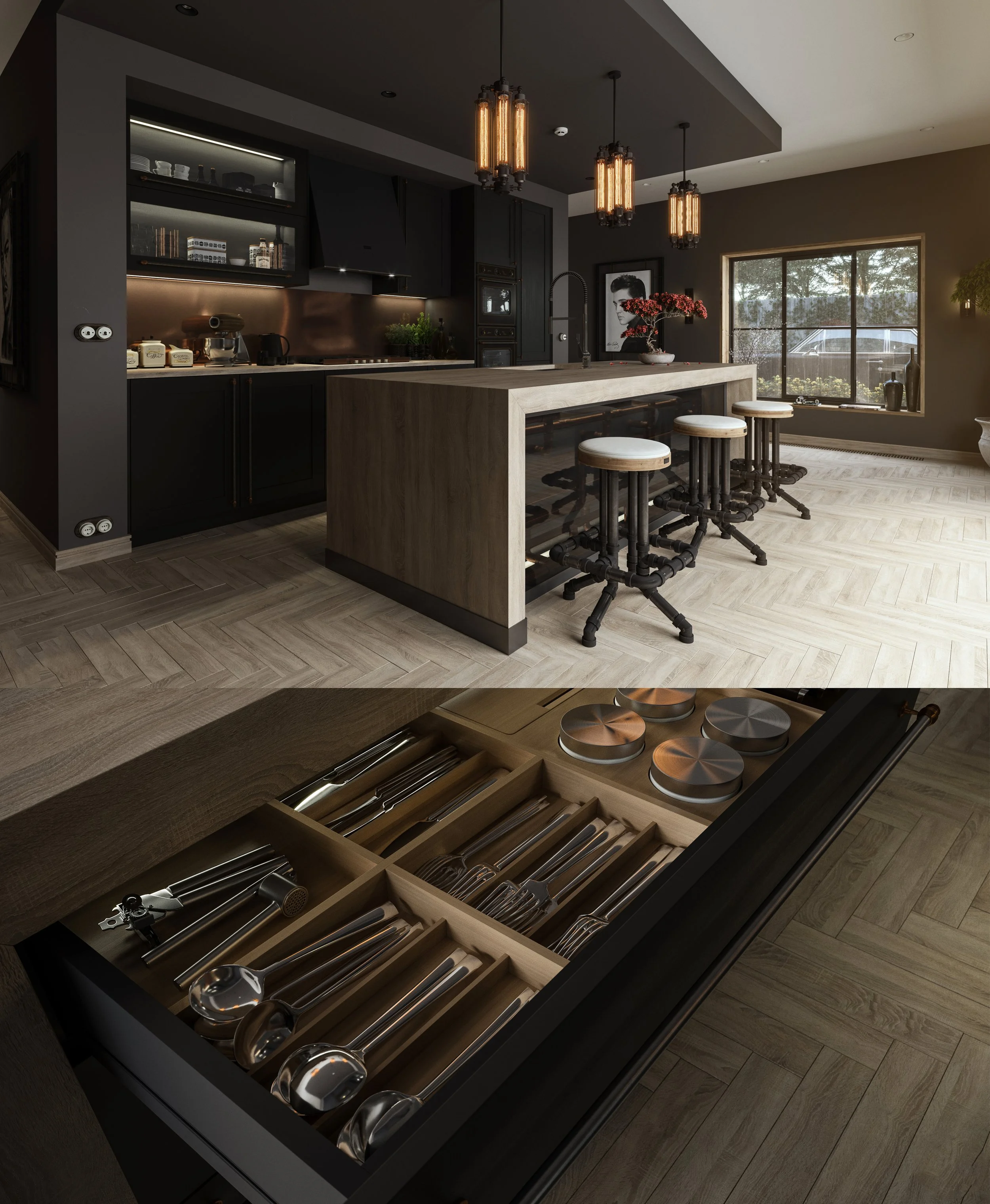 Kitchen CGI 3D Rednering Visualization California Old School Vintage Interior Design Black View fullsize