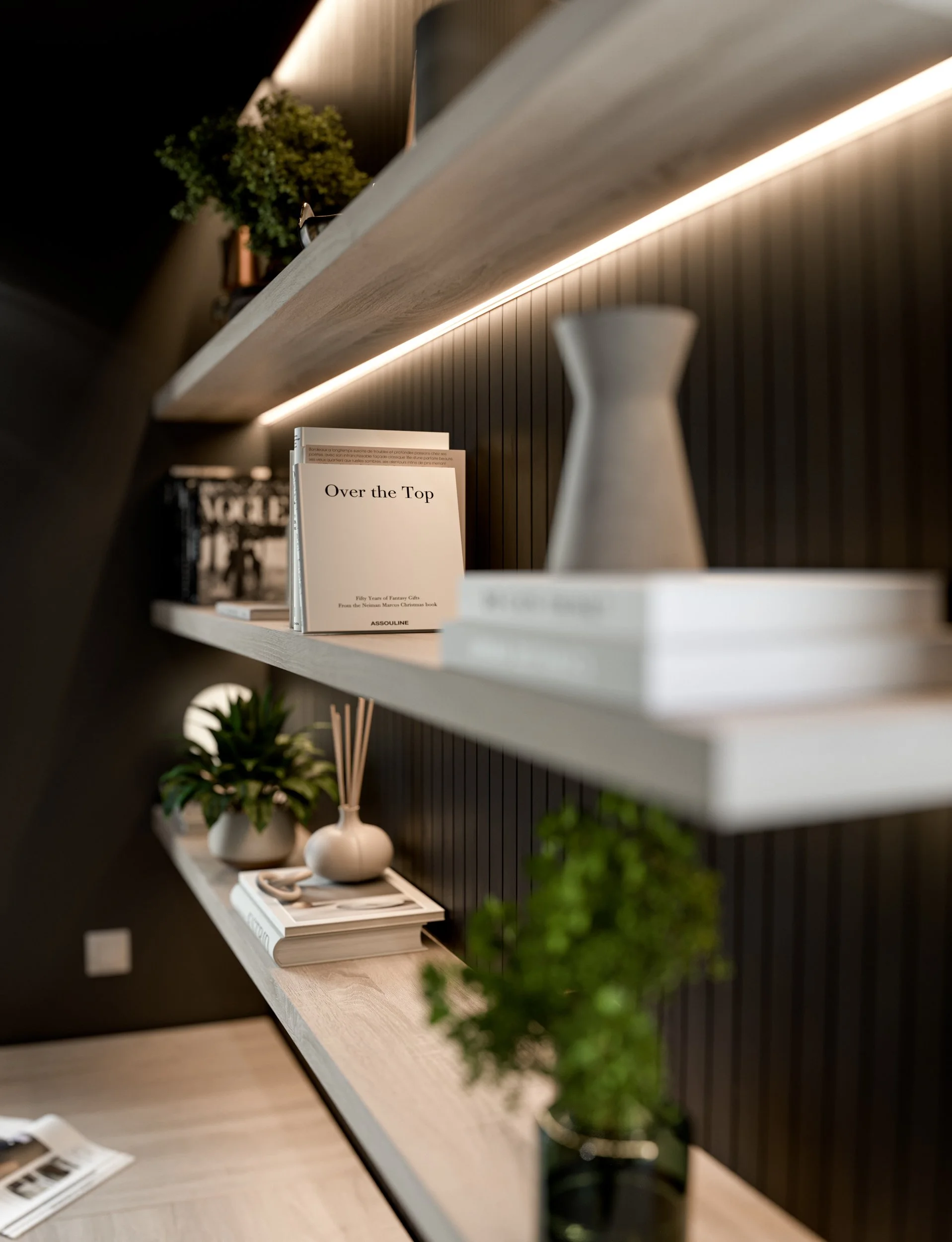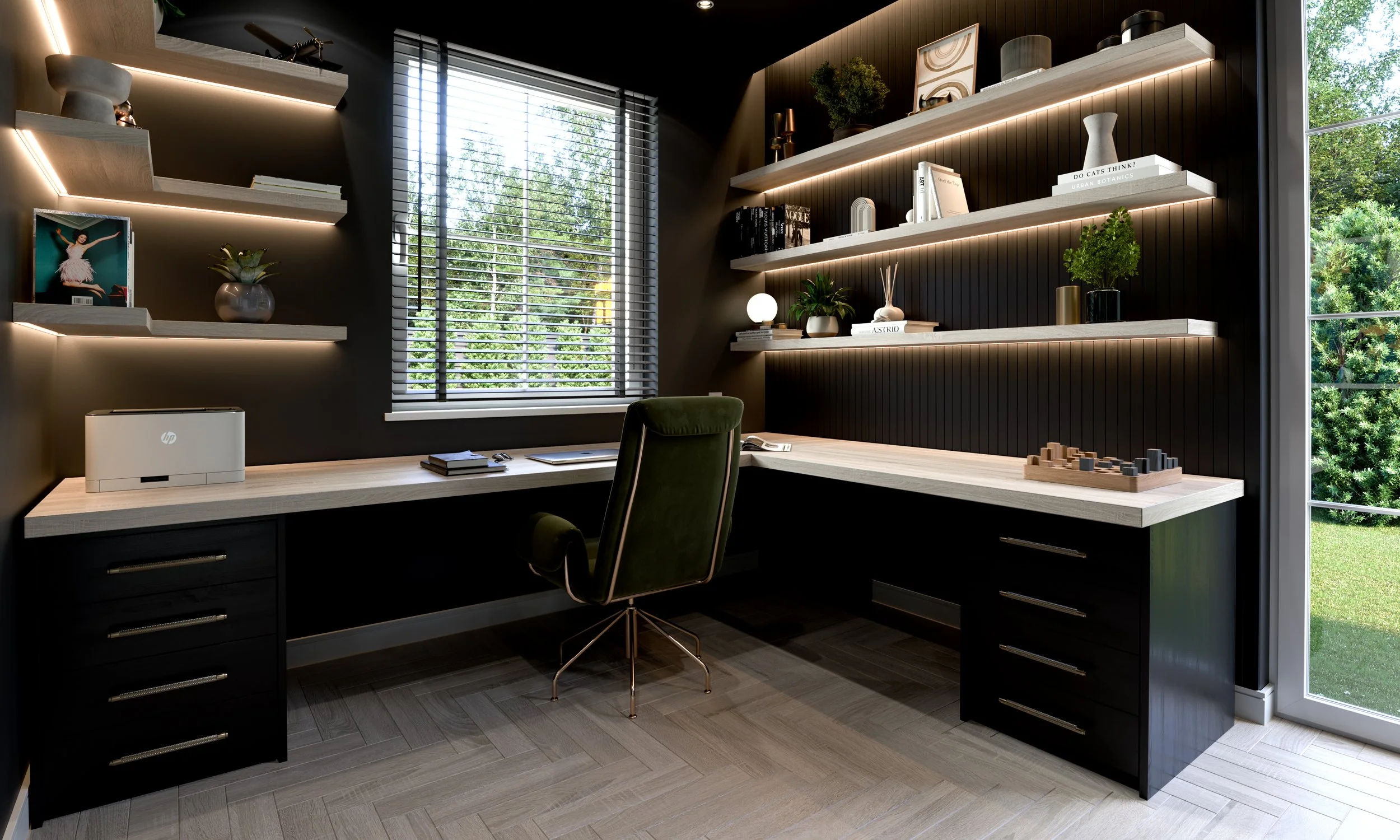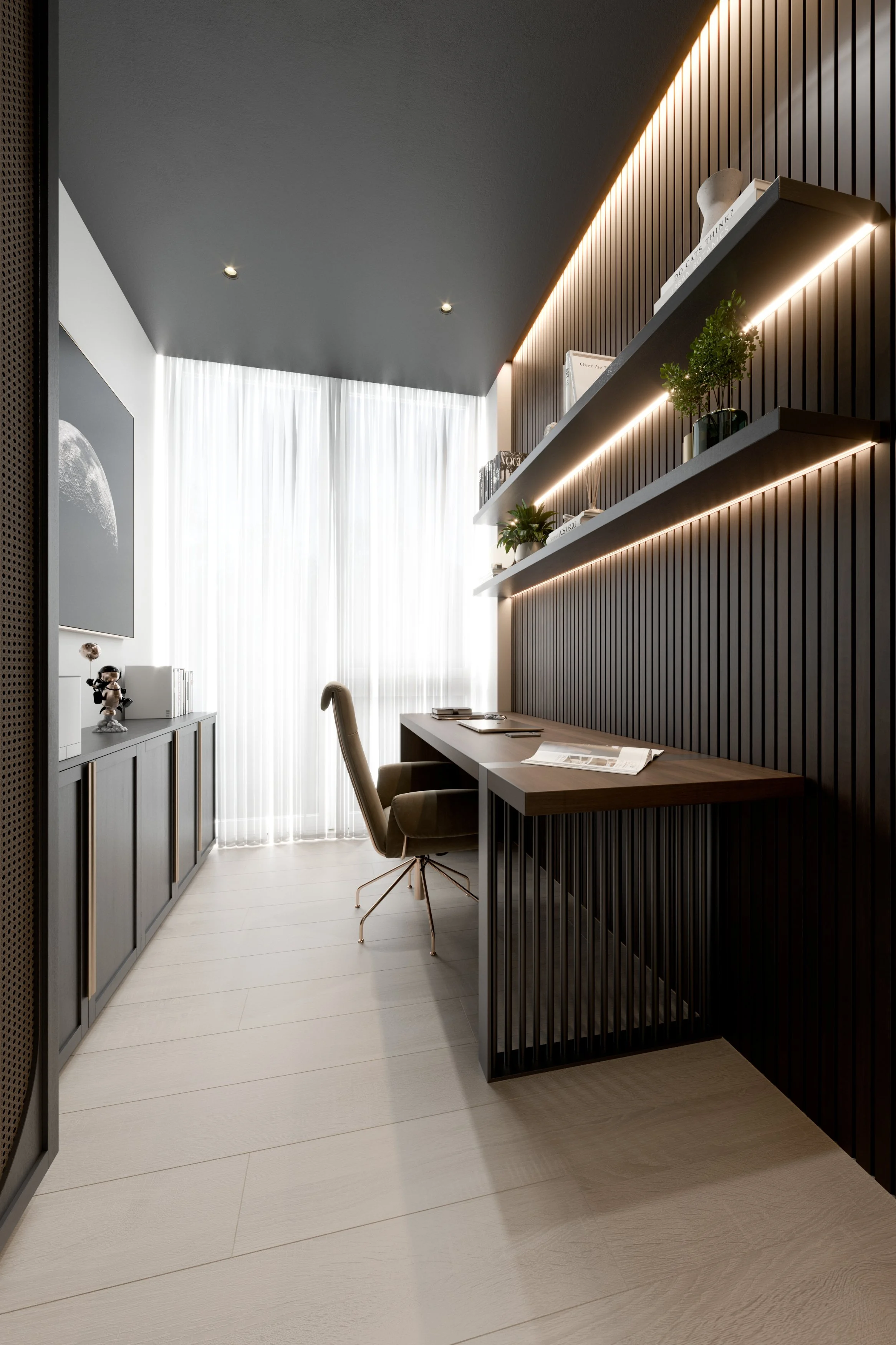 Modern home office with a wooden desk, a brown upholstered office chair, black vertical slat wall, open shelves with books and plants, white sheer curtains, and soft ambient lighting.
