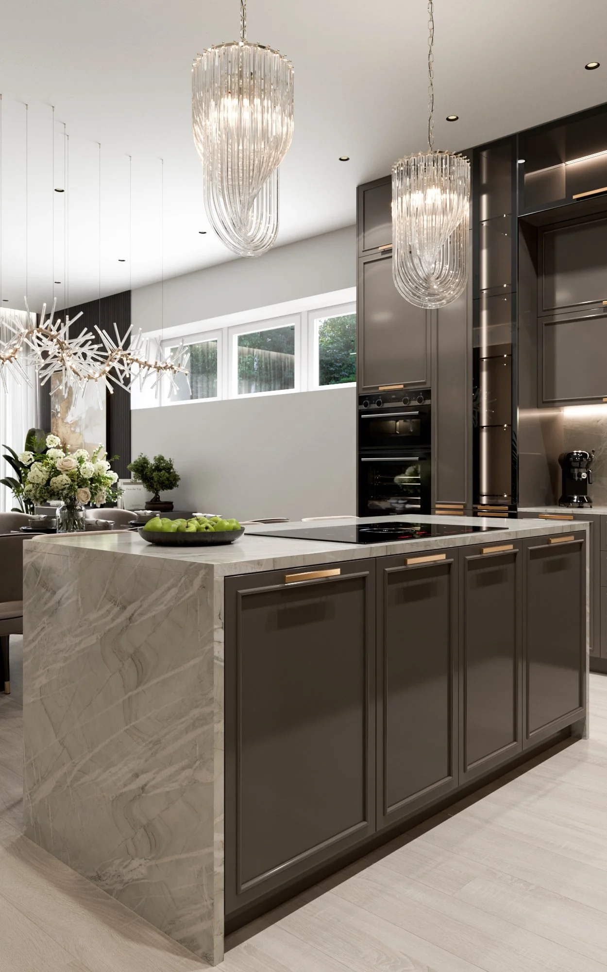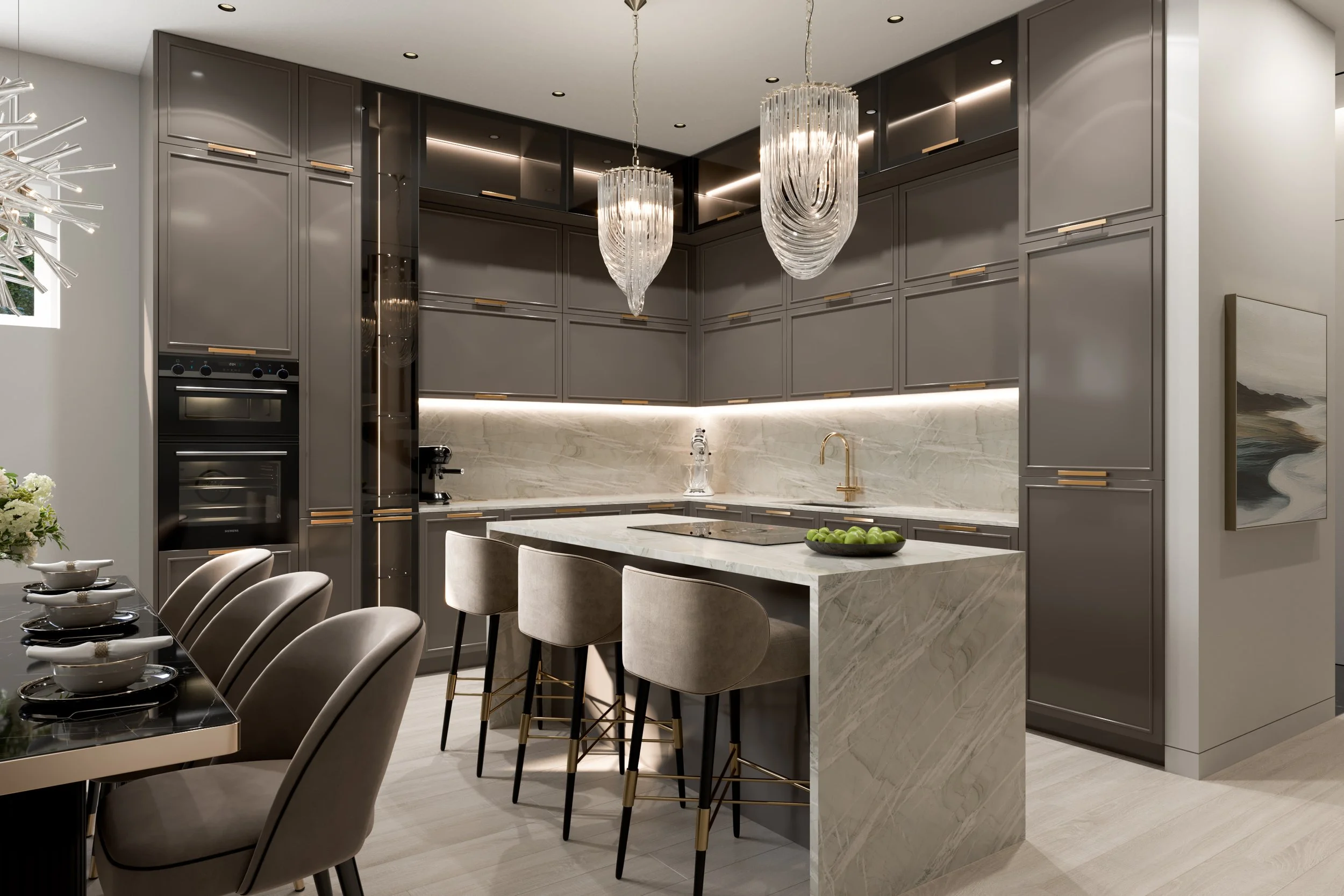 Bespoke Kitchen Visualisations Classic Interior Design Modern Grey Beige Marble Island Rendering CGI