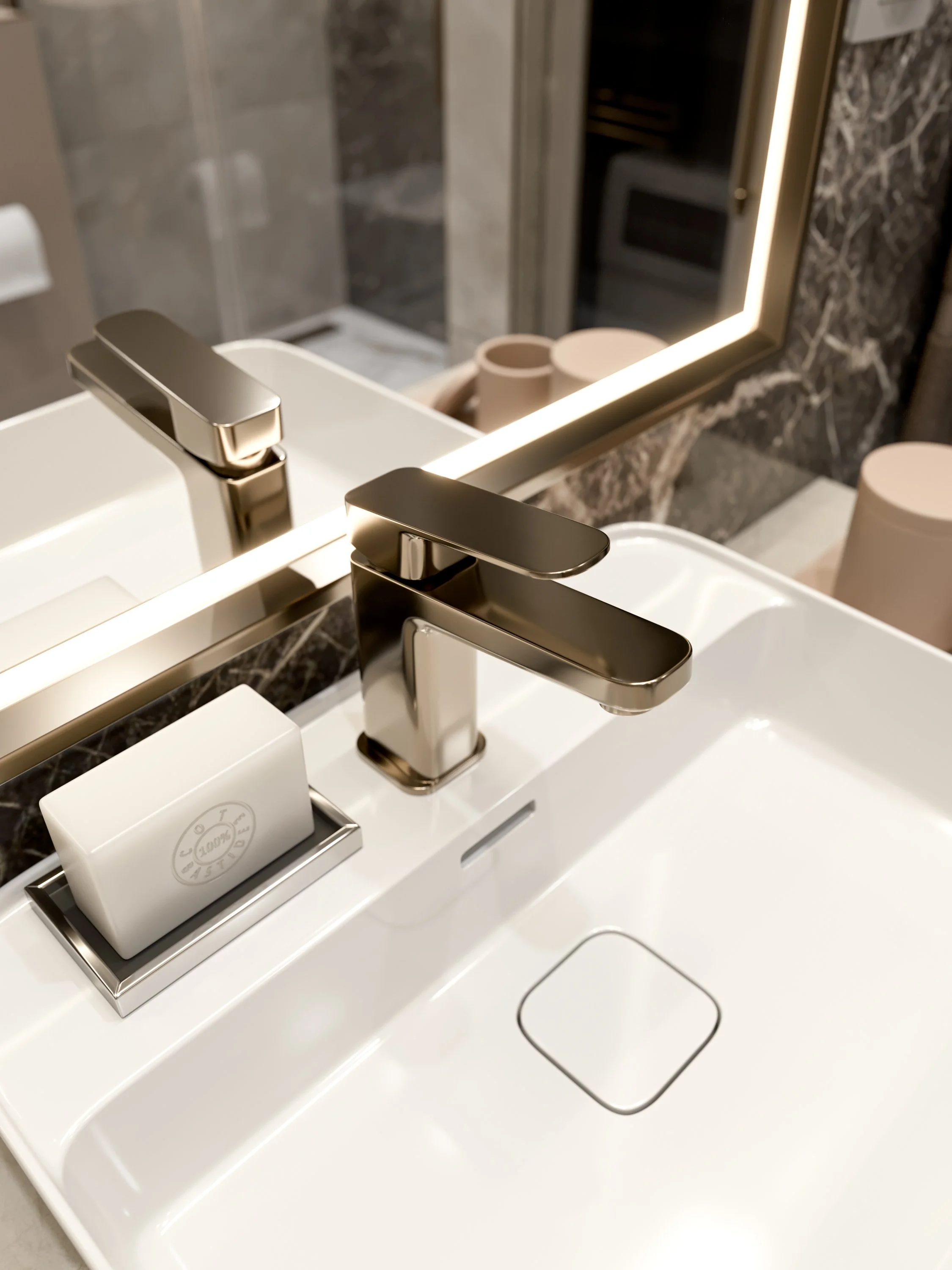 Bespoke Navy Blue Bathroom Rose Gold Vanity Unit 3D Architectural Visualization Rendering Tap Faucet Mixer