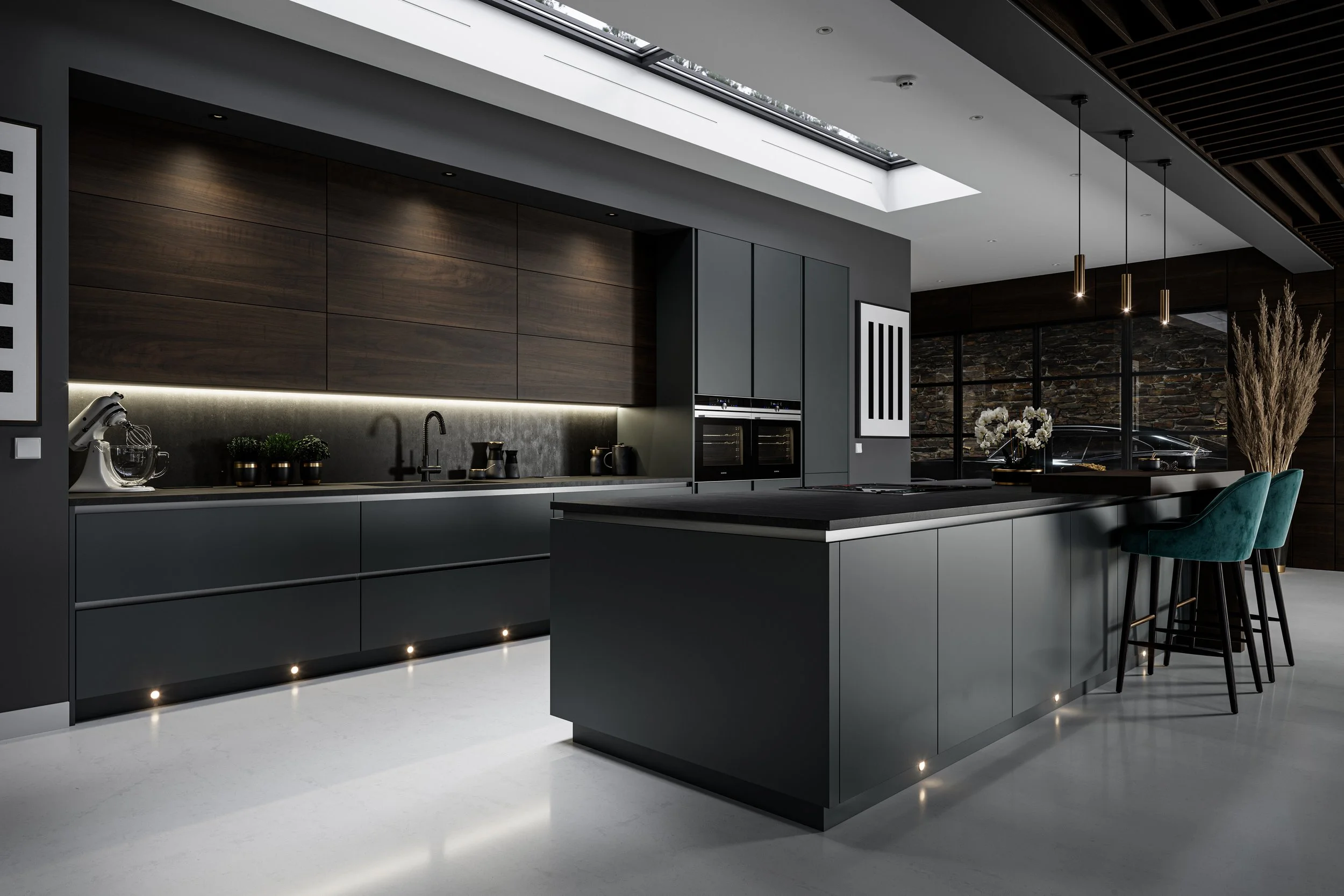 Architectural Kitchen Visualization 3D Rendering Island Shot Natural Light Minimal Interior Design Skylight View fullsize