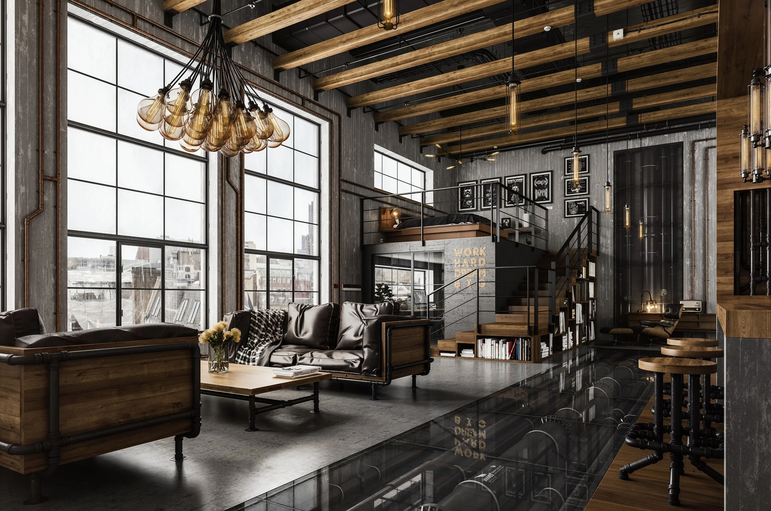 Industrial Loft Interior Design Room Space 3D Visualization Visualisation Rendering Photography Restoration Hardware Metal Pipe Sofa View fullsize