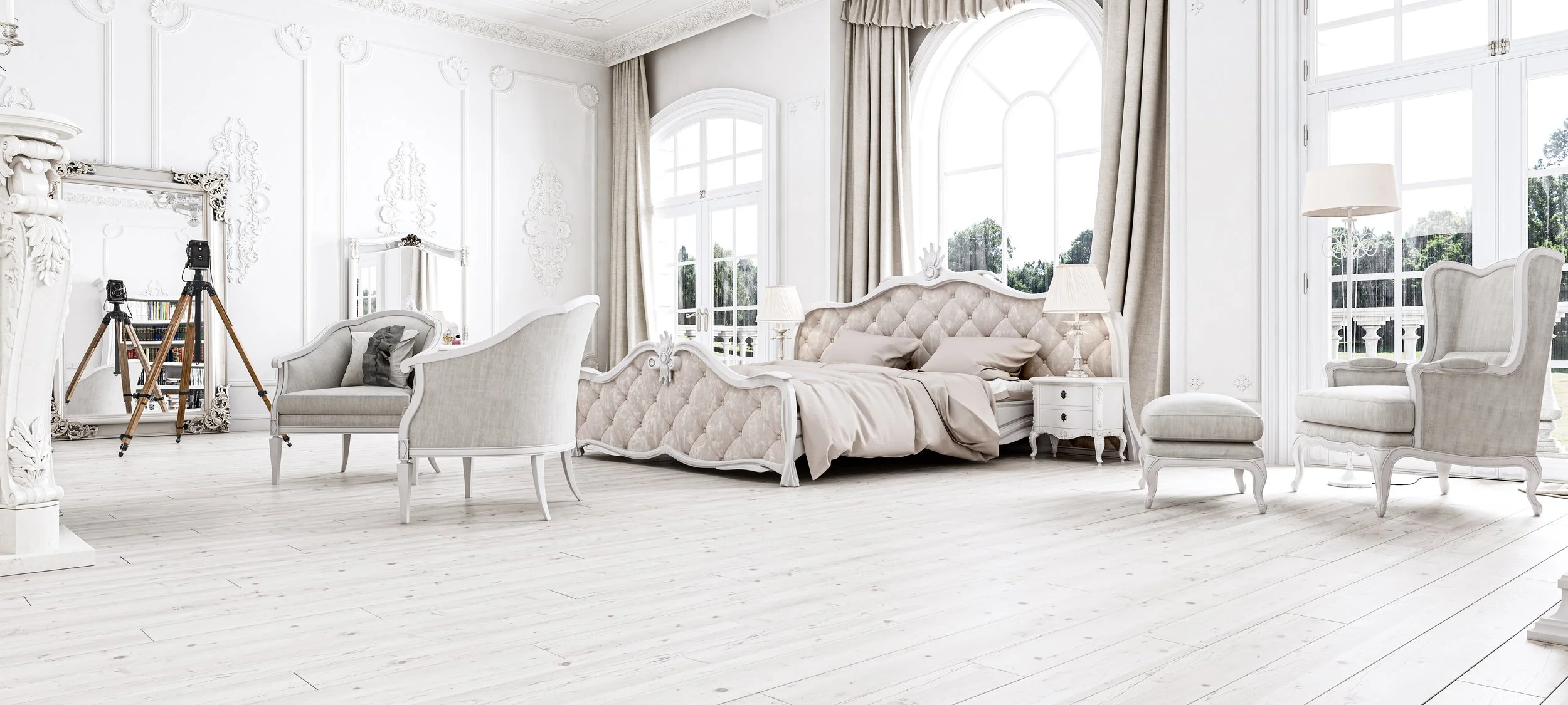 White Bedroom Visualisation Rendering Flooring Bed Dressing Table Classic Rendering CGI View fullsize