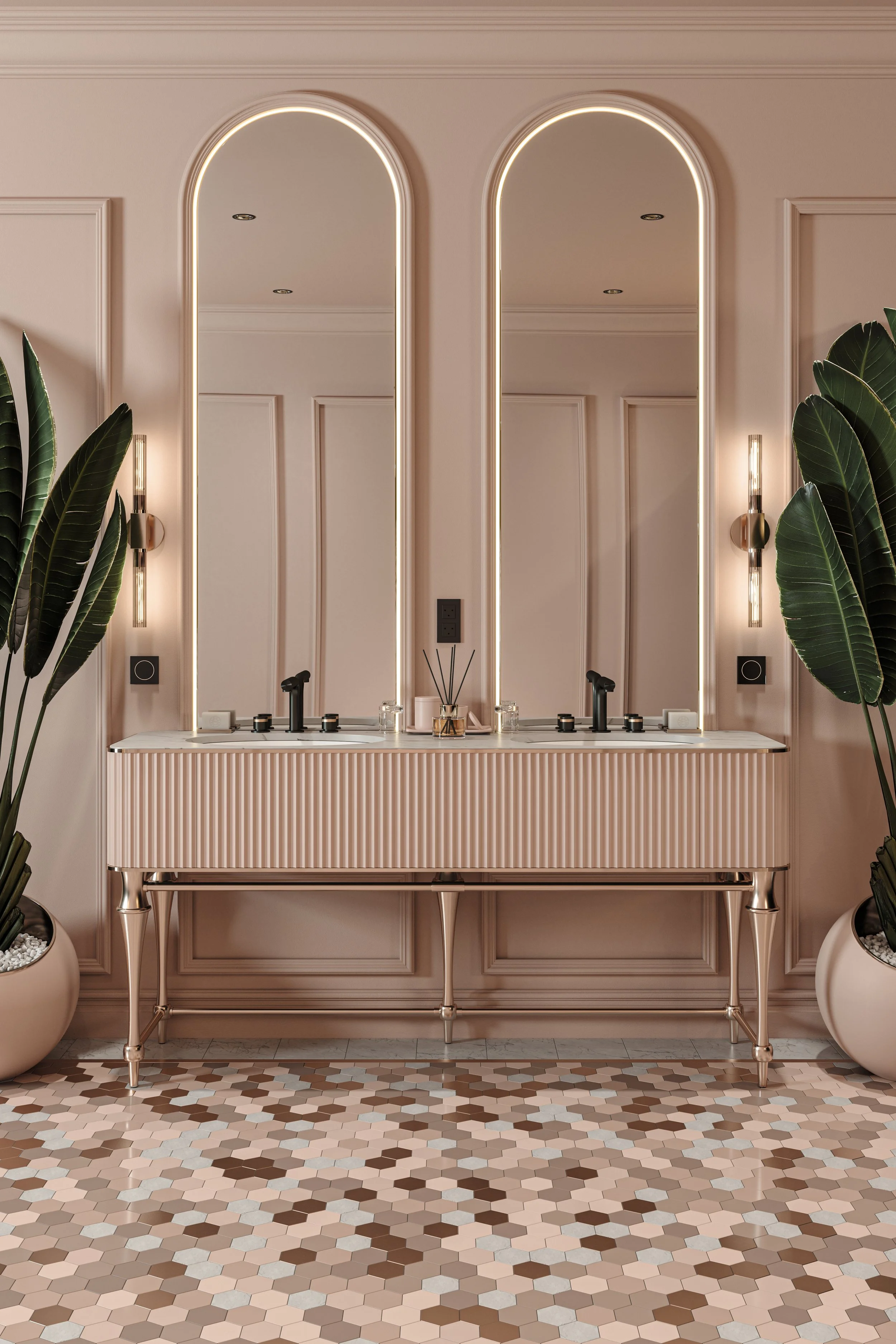 Bespoke Peach Rose Gold EnSuite Bathroom 3D Architectural Visualization Rendering Interior Design UK View fullsize