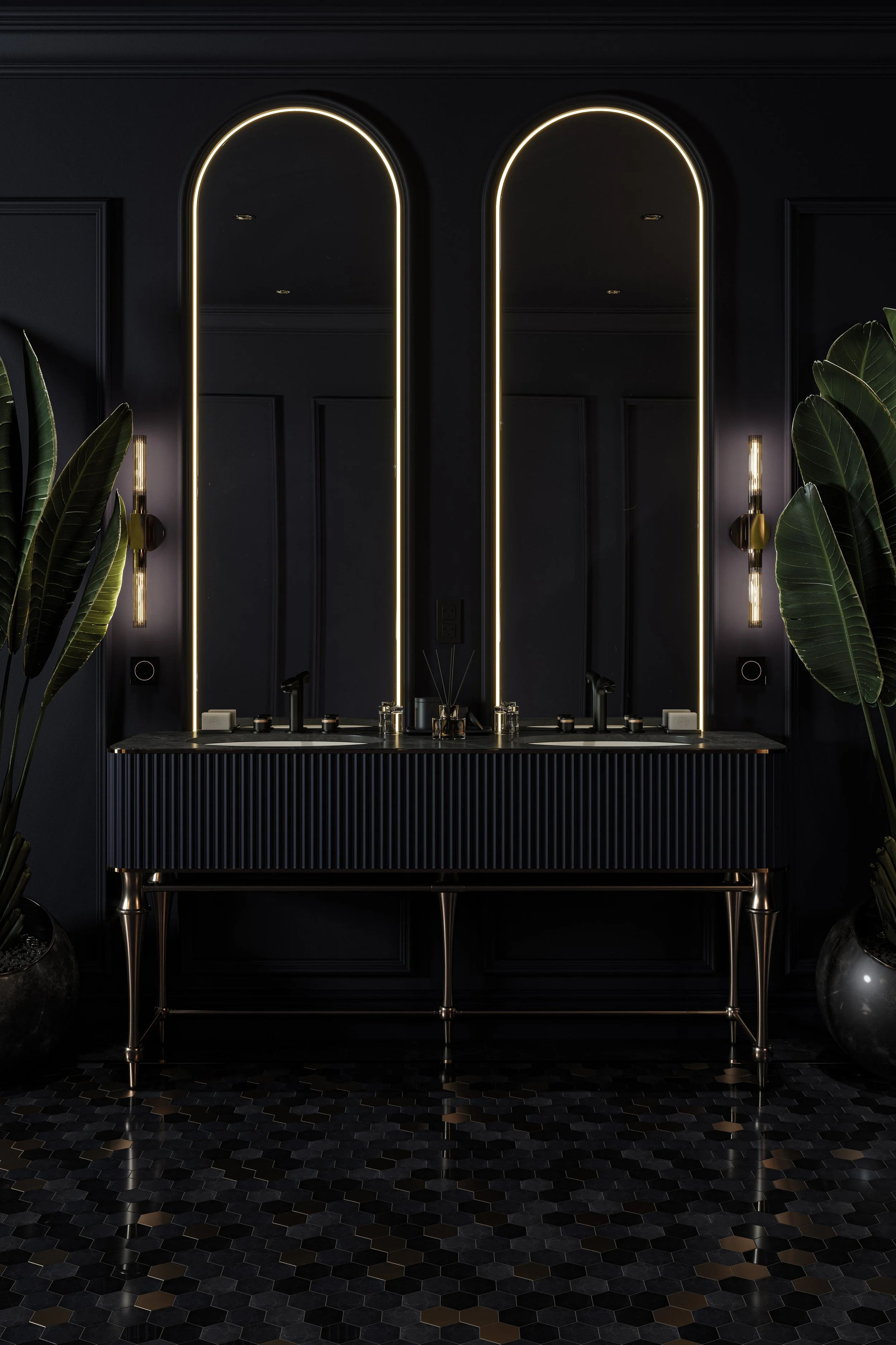 Bespoke Navy Blue Bathroom Rose Gold Vanity Unit 3D Architectural Visualization Rendering United Kingdom