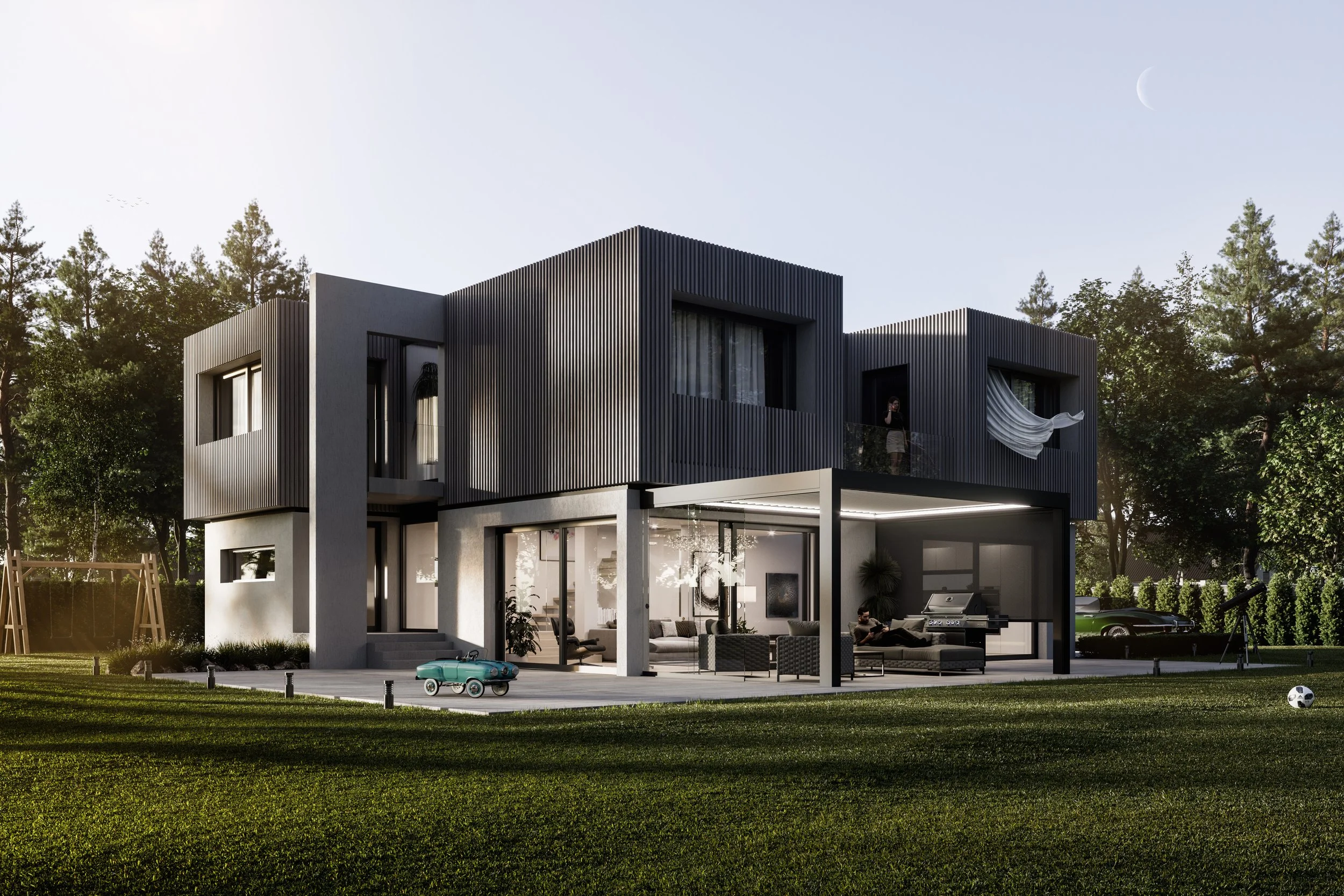 External House Building Development Visualization CGI Rendering in Switzerland Sunny Evening Golden Hour