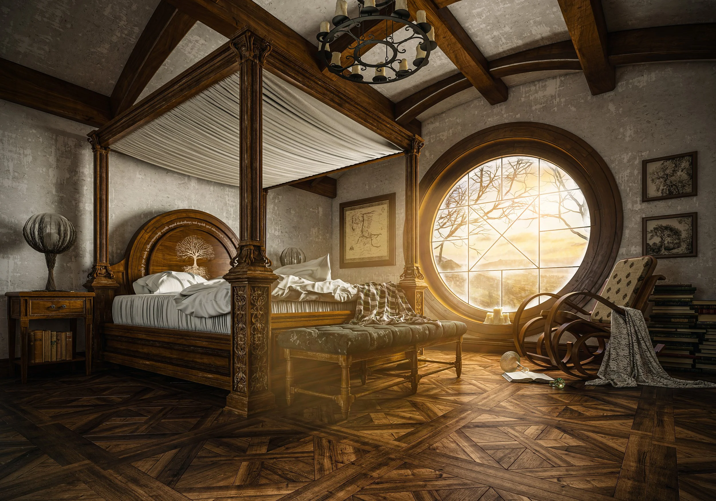 Artistic The Hobbit Bedroom Interior Design 3D CGI Visualization Rendering Evening Moody Enironment View fullsize